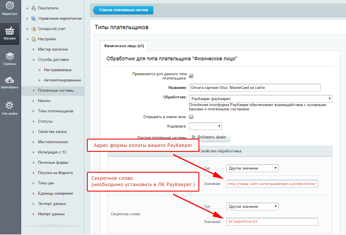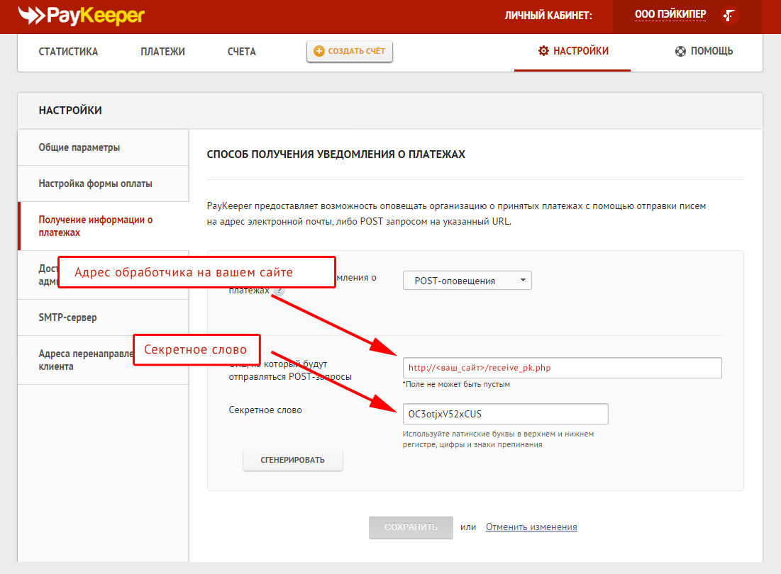 Рисунок 4. Указание настоек в личном кабинете PayKeeper.