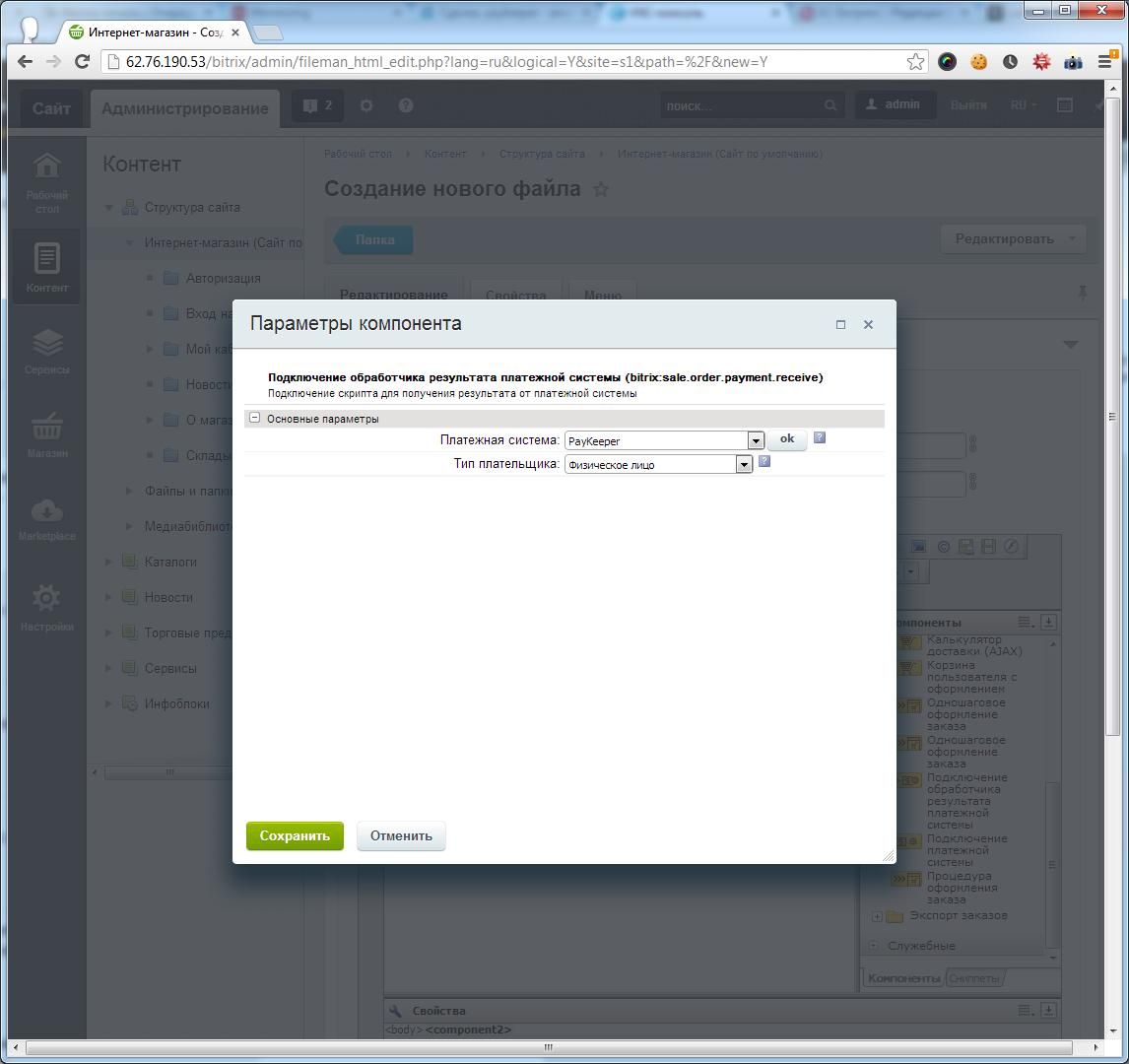 В списке компонентов в правой части редактора выберите «Магазин»-> «Процедура оформления заказа» и перетащите компонент «Подключение обработчика результата платежной системы» в область редактирования. После этого сделайте на нём двойной клик, чтобы открылось окно параметров компонента (рисунок 6). В выпадающем списке «Платёжная система» выберите «Оплата Visa/MasterCard» (то значение которое вы указали в пункте 3), тип плательщика – выберите нужный тип плательщика (например, физическое лицо). Чтобы завести обработчики для других типов плательщика нужно повторить действия из этого шага. После редактирования параметров нажмите кнопку «Сохранить», введите имя файла (например, receive_pk.php), любой заголовок и сохраните результат. Адрес обработчика в формате http://<ваш_сайт>/receive_pk.php нужно указать в личном кабинете PayKeeper. См. рисунок 4.