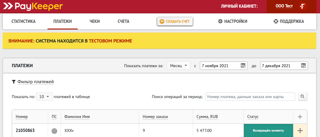 Контроль произведенного возврата, а также Чек, вы сможете увидеть в личном кабинете Paykeeper.