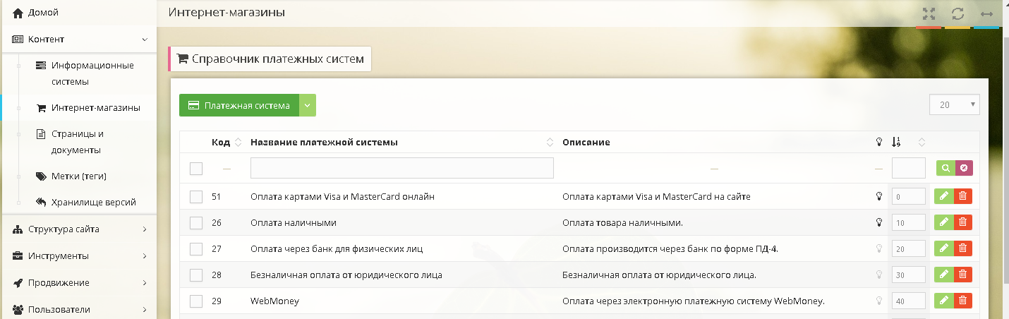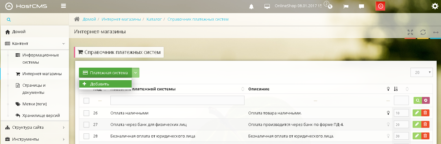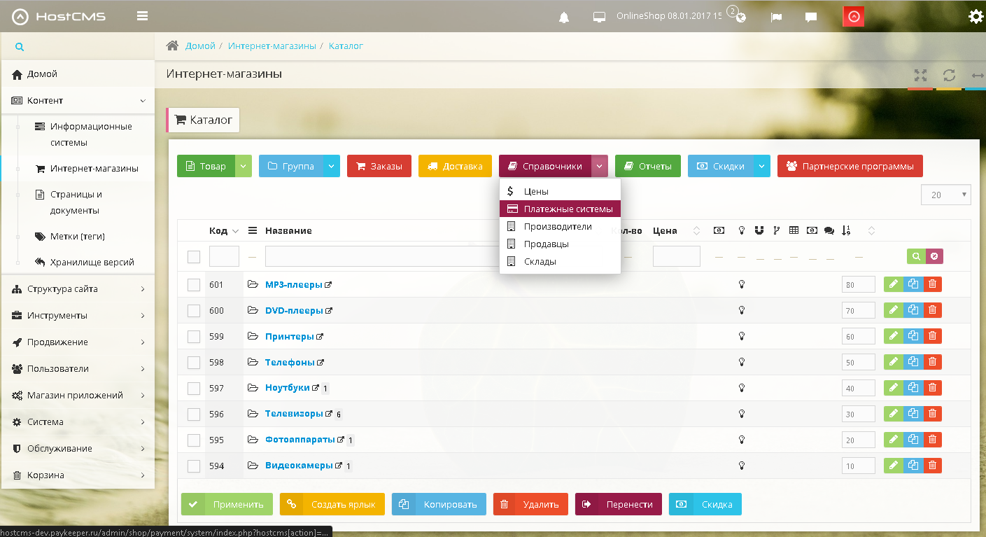 Для того, чтобы добавить способ оплаты через платежную платформу PayKeeper, зайдите в панели администрирования CMS в раздел Контент > Интернет-магазины. В списке магазинов выберите Ваш магазин и кликните по его названию – откроется страница со списком категорий Вашего магазина. В верхнем меню Справочники выберите пункт Платежные системы (рис. 1).