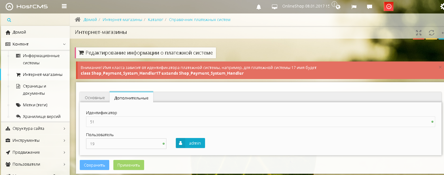 Справа от только что добавленного способа оплаты нажмите на значок Редактировать. На странице редактирования перейдите на вкладку Дополнительно. Запомните значение поля Идентификатор (рис. 5)