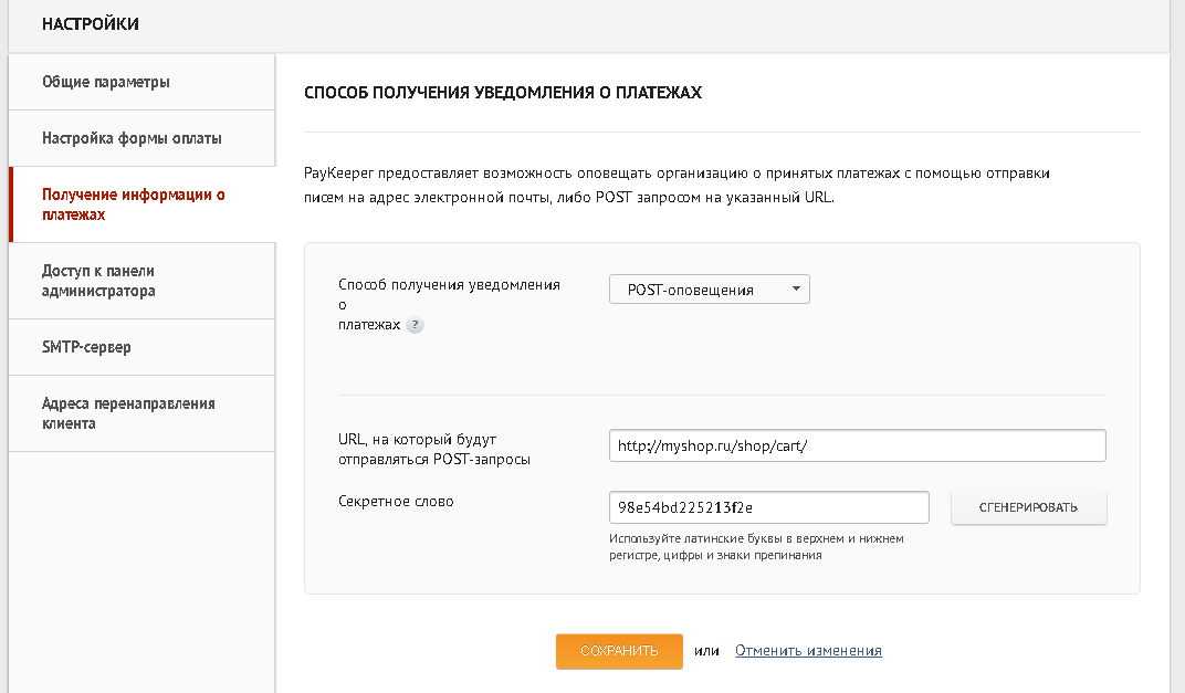 В личном кабинете PayKeeper зайдите в раздел Настройки > Получение информации о платежах. Измените Способ получения уведомления о платежах на POST-оповещения.