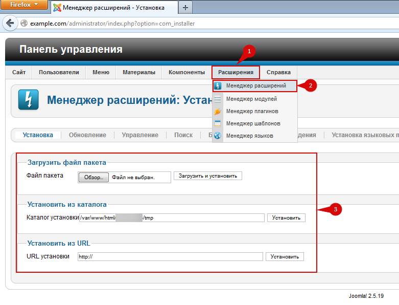В панели администрирования Joomla перейдите в раздел «Расширения» (рисунок 1, цифра 1) и выберите пункт «Менеджер расширений» (рисунок 1, цифра 2). На открывшейся странице установите модуль PayKeeper любым удобным для Вас способом (рисунок 1, цифра 3).