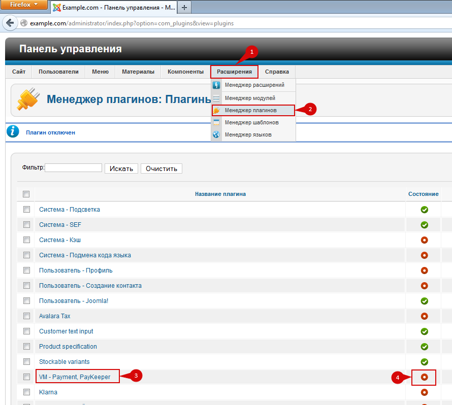 В панели администрирования Joomla перейдите в раздел «Расширения» (рисунок 2, цифра 1) и выберите пункт «Менеджер плагинов» (рисунок 2, цифра 2). На открывшейся странице найдите модуль «VM – Payment, PayKeeper» (рисунок 2, цифра 3) и включите его – нажав на красный круг в столбце «Состояние» (рисунок 2, цифра 4). После включения выбранного модуля иконка в столбце «Состояние» должна смениться на зеленый круг с галочкой.