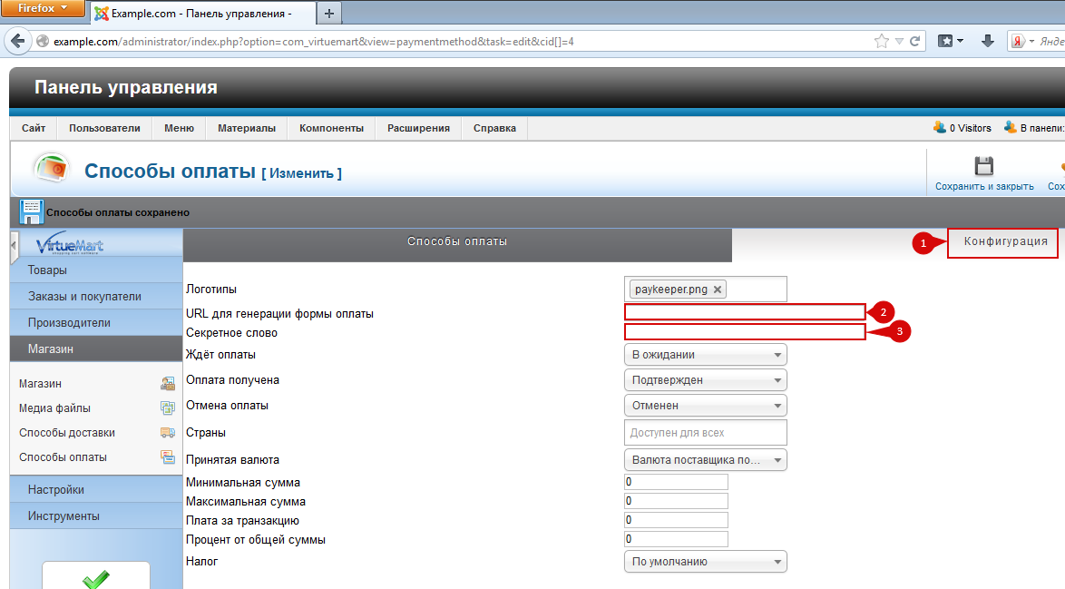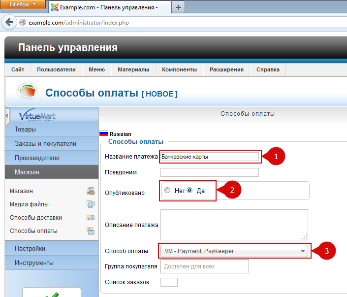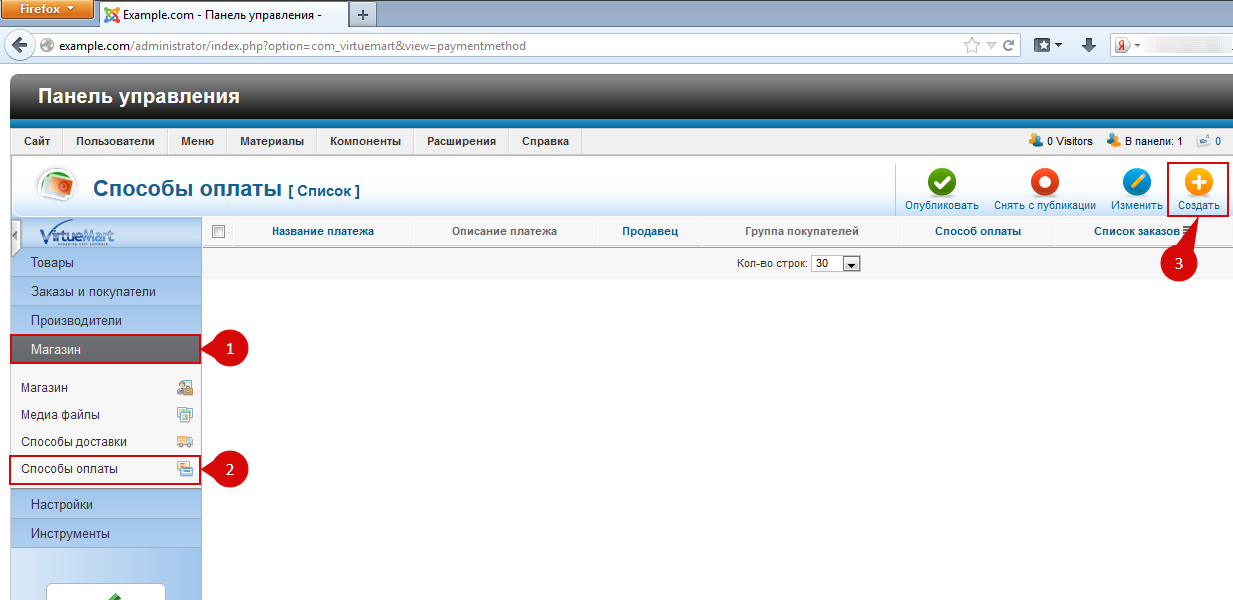 В панели администрирования Virtuemart в разделе «Магазин» (рисунок 3, цифра 1) нажмите ссылку «Cпособы оплаты» (рисунок 3, цифра 2) и на открывшейся странице нажмите кнопку «Создать» (рисунок 3, цифра 3).