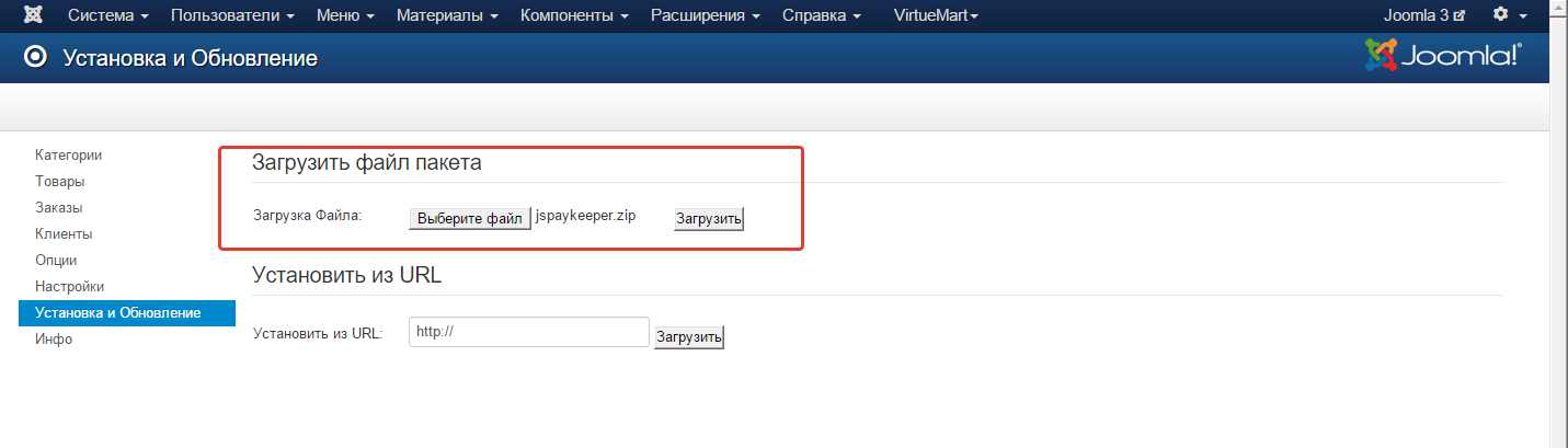 В панели администрирования Joomla перейдите в раздел «Компоненты-JoomShopping-Установка и Обновление». На открывшейся странице выберите и загрузите архив jspaykeeper.zip.