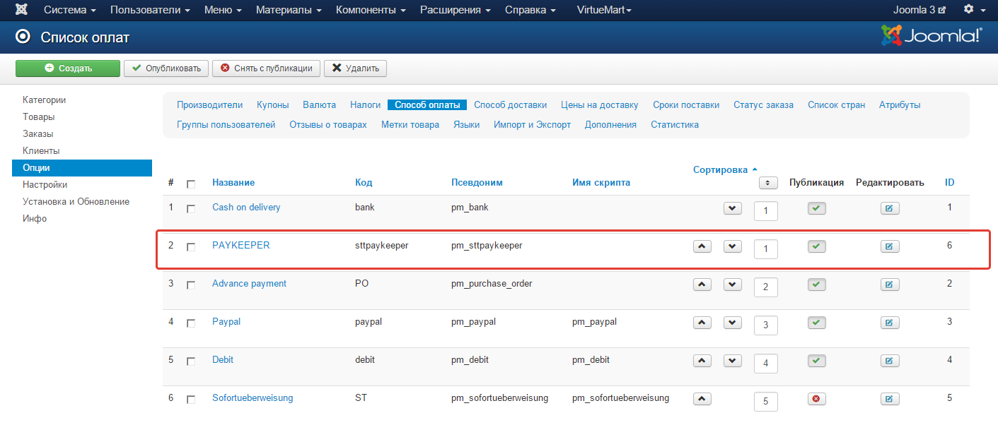В панели администрирования Joomla перейдите в раздел «Компоненты-JoomShopping-Опции» и выберите пункт «Способы оплаты».