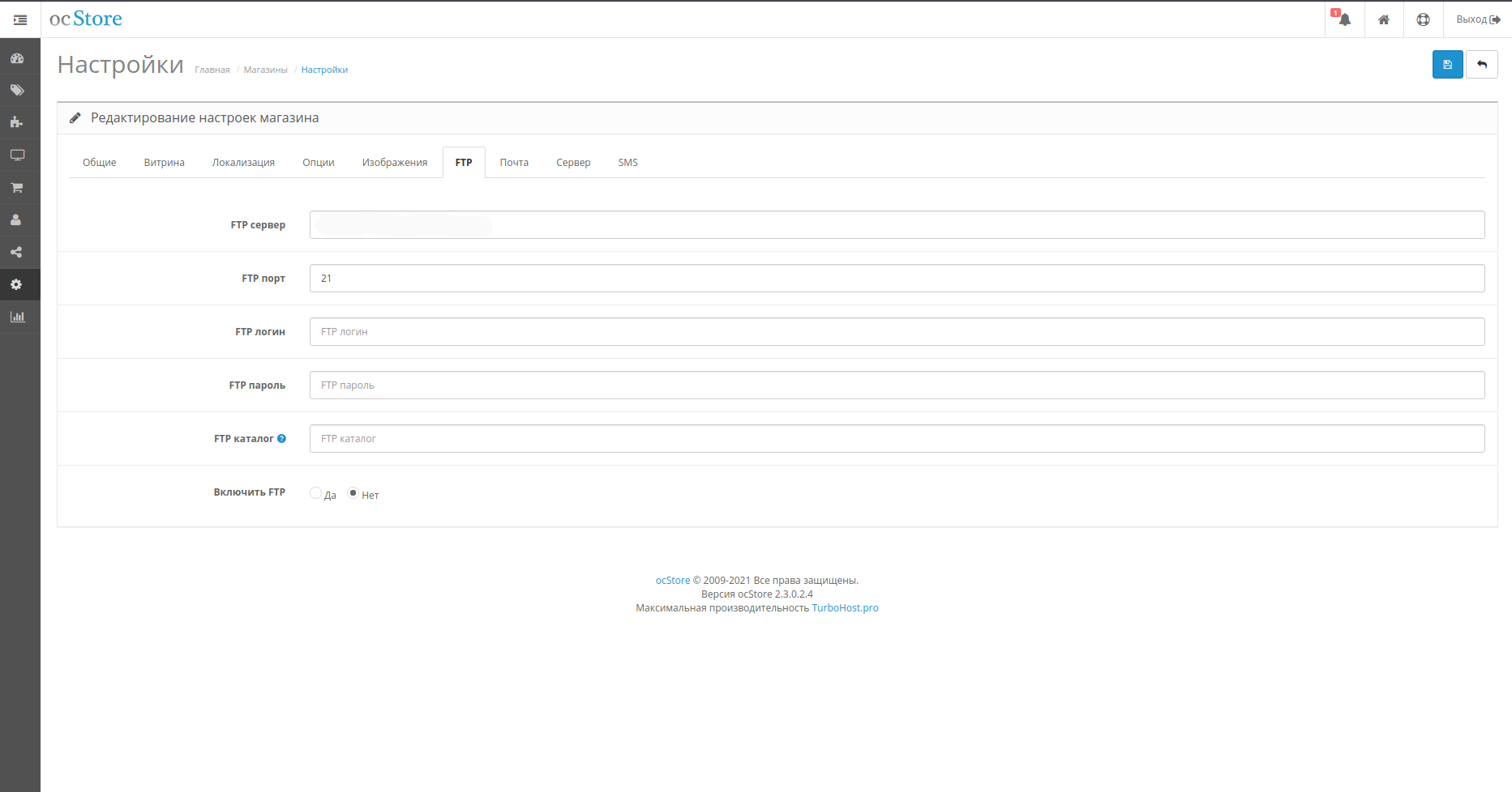 Для использования FTP необходимо его настроить т.е. заполнить параметы FTP в админке Система > Настройки > Магазин > вкладка FTP (Рис.1)