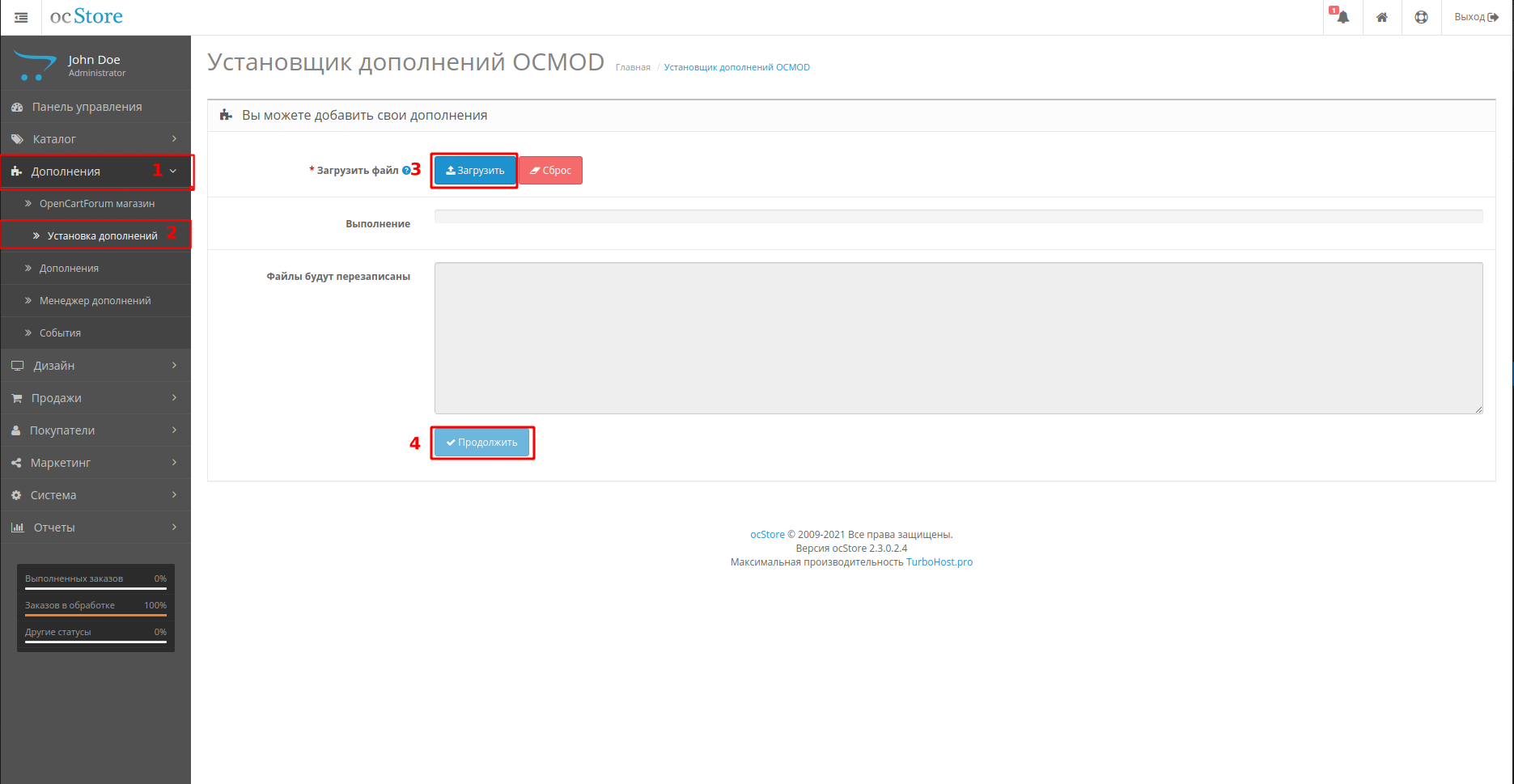 Модуль должен быть упакован в ZIP архив. В архиве, корневой должна быть папка upload. В папке upload, должны находится папки admin и catalog, тогда CMS примет модуль к установке. Необходимо перейти в Панель управления — Дополнения(цифра1 рис.2) — Установка дополнений(цифра 2 рис.2). Нажать кнопку «Загрузить»(цифра 3 рис.2), выбрать архив с модулем и после загрузки нажать кнопку «Продолжить»(цифра 4 рис.2). Модуль будет установлен в CMS.