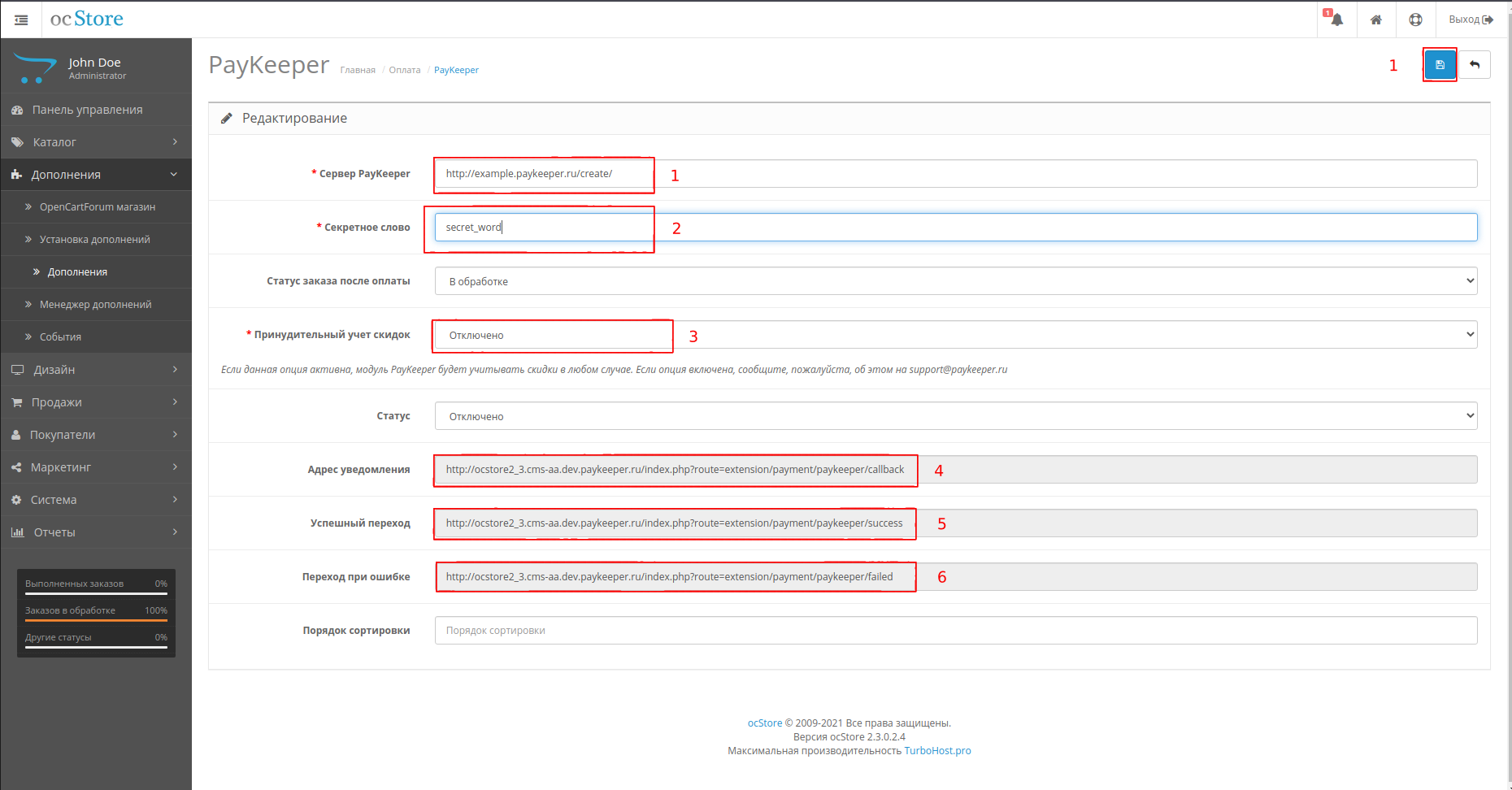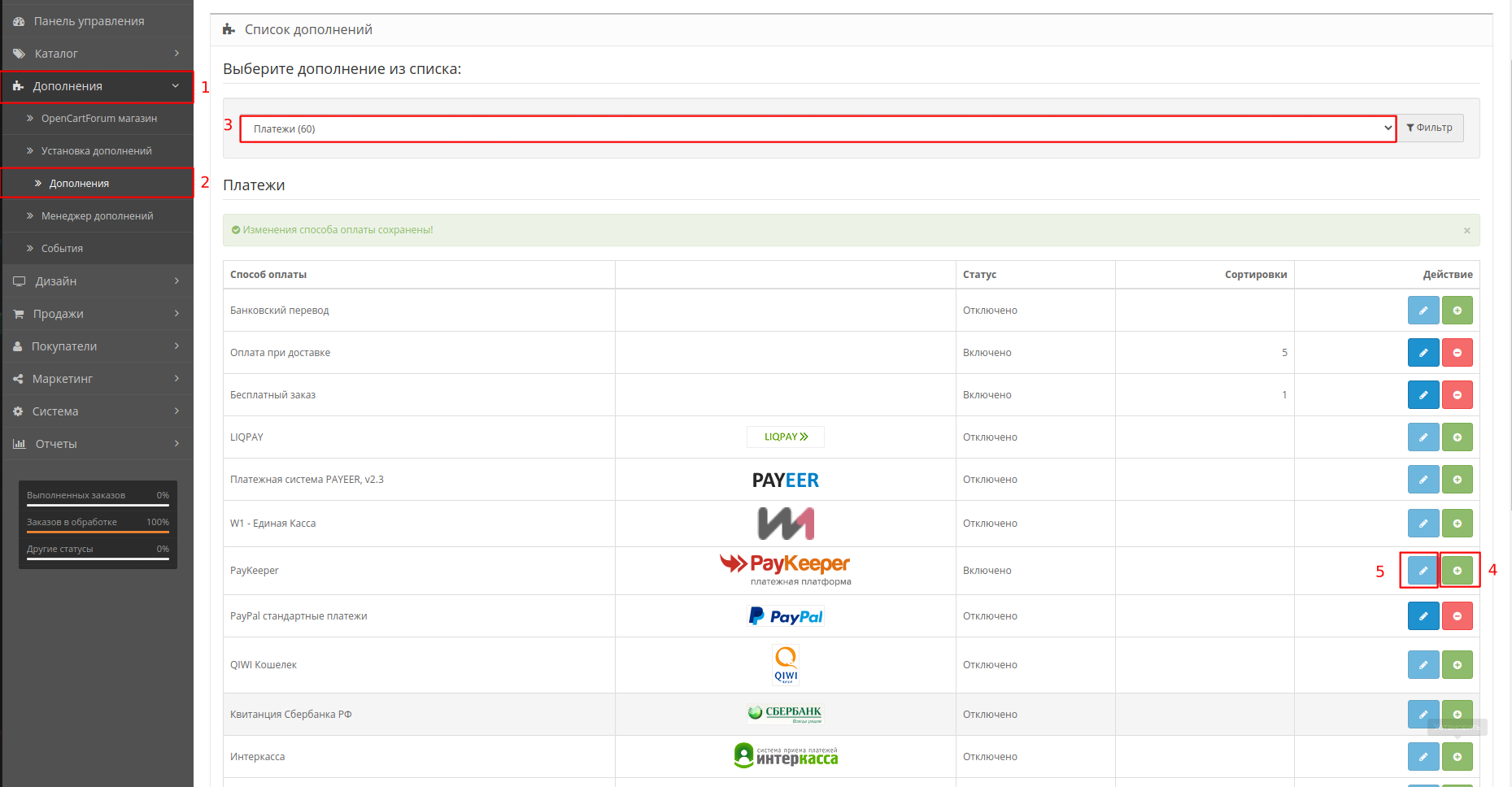Необходимо перейти в панель управления — Дополнения (цифра 1 рис.3) — Дополнения (цифра 2 рис.3). Выбрать в выпадающем списке (цифра 3 рис.3) опцию «Платежи». Найти и включить модуль «paykeeper» нажатием на кнопку «+»(цифра 4 рис.3). Перейти в настройки модуля нажатием кнопки «Редактировать»(цифра 5 рис.3).
