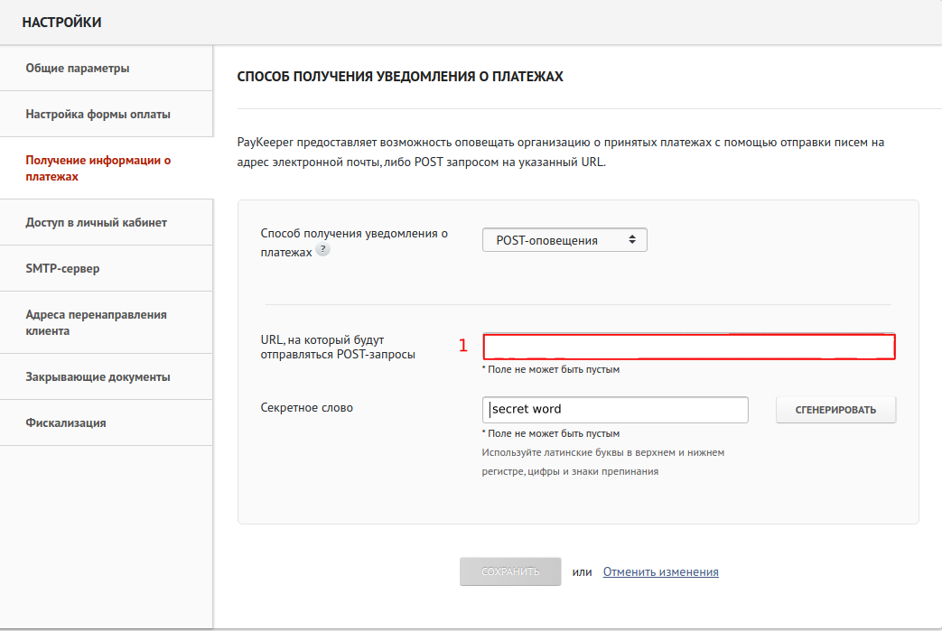 Секретное слово, которое Вам нужно сгенерировать в личном кабинете PayKeeper.