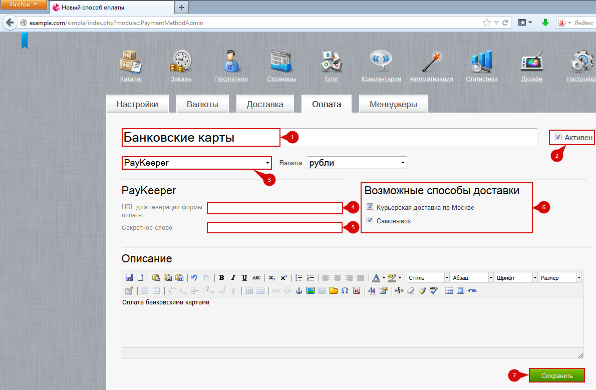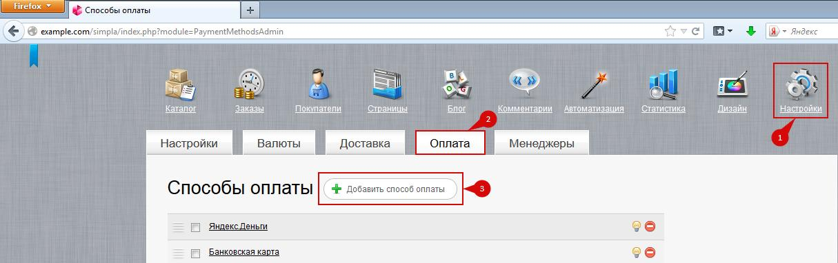 В панели администрирования Simpla перейдите в раздел «Настройки» (рисунок 1, цифра 1), выберите вкладку «Оплата» (рисунок 1, цифра 2) и нажмите кнопку «Добавить способ оплаты».