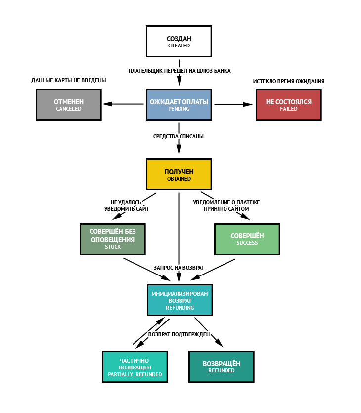 Статусы платежей изменяются в соответствии с диаграммой состояний. Статусы «получен» (obtained), «совершён без оповещения» (stuck), «совершён» (success) эквивалентны с точки зрения поступления средств на расчётный счёт предприятия. Все они означают, что у держателя была списана сумма транзакции, и она либо уже зачислилась, либо в ближайшее время зачислится на расчётный счёт предприятия. Статусы «отменён» (canceled) и «не состоялся» (failed) означают, что платеж провести не удалось.