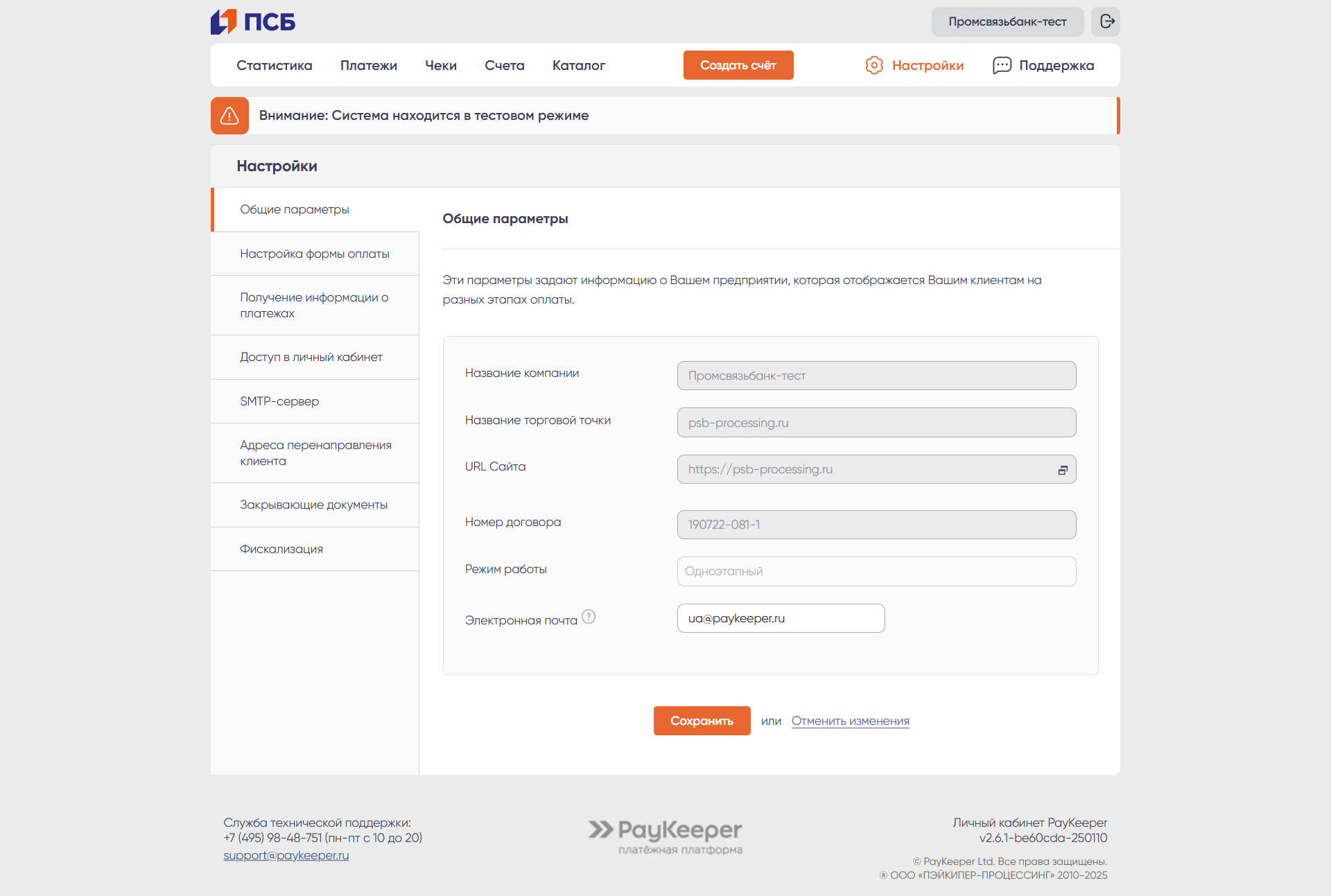 На вкладке «Общие параметры» можно скорректировать только адрес электронной почты. Все остальные параметры изменяются через запрос в техническую поддержку.