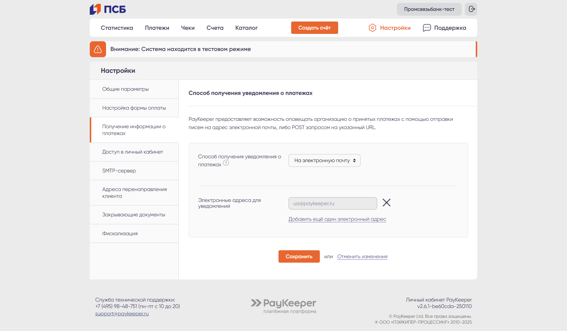 Раздел настроек личного кабинета PayKeeper делится на подразделы:
