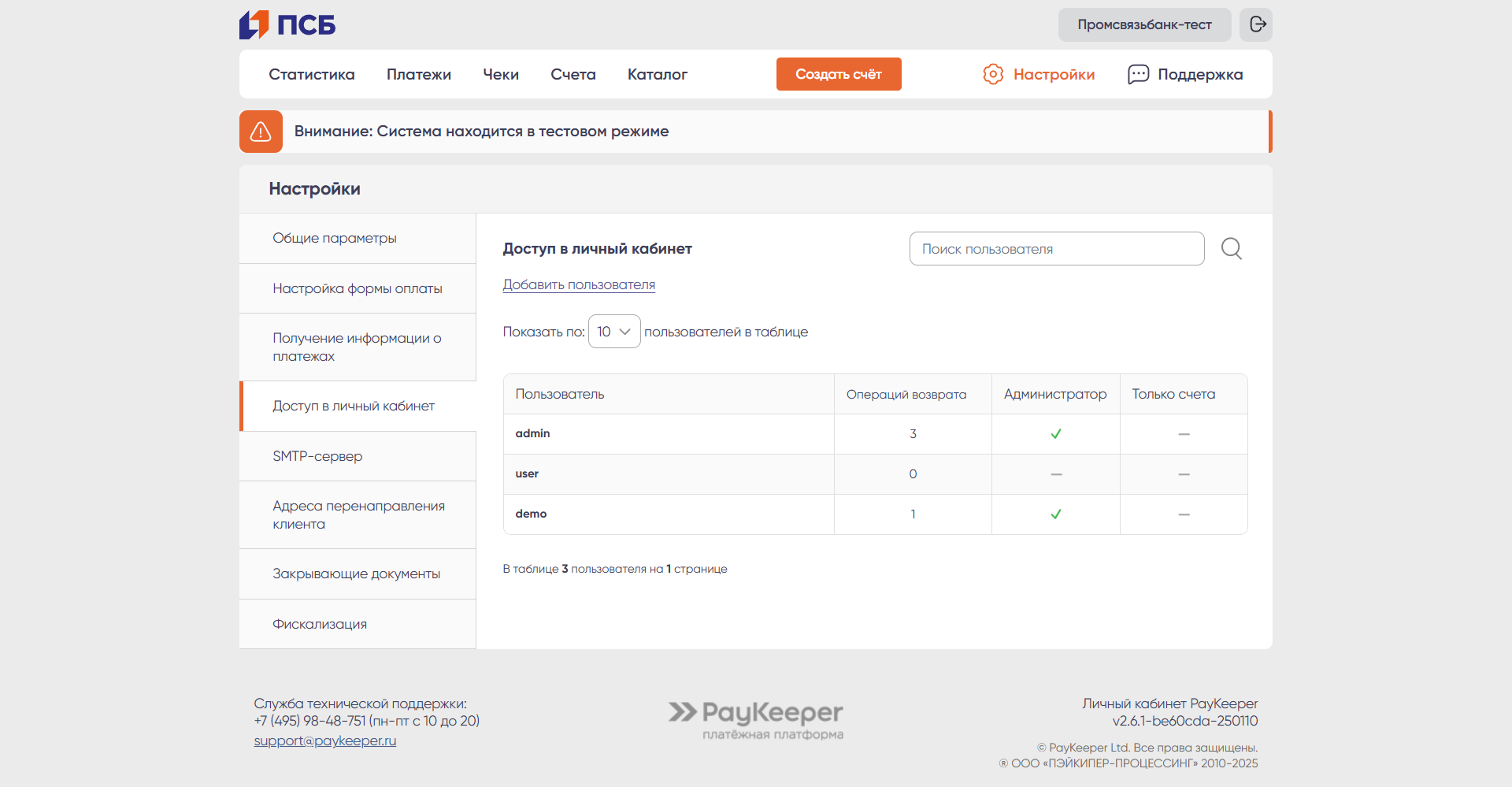 В разделе можно добавить, удалить либо отредактировать права пользователей личного кабинета. Можно добавить неограниченное количество пользователей, установить либо поменять для каждого пользователя пароль для входа в личный кабинет, установить лимит на количество возвратов в сутки, а также назначить либо забрать администраторские полномочия, которые позволяют изменять настройки в личном кабинете PayKeeper.