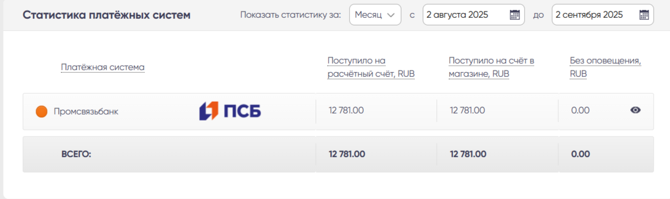 Напротив каждой платежной системы выведена статистика по суммарному обороту денежных средств, прошедших за выбранный период. Период устанавливается в фильтре дат, расположенном над блоком статистики.